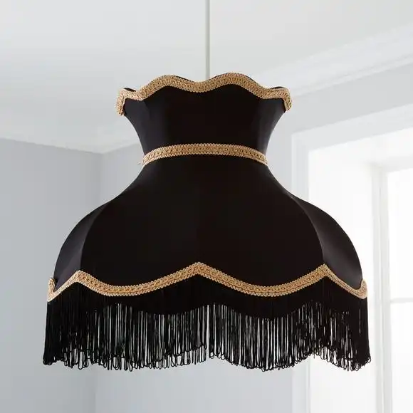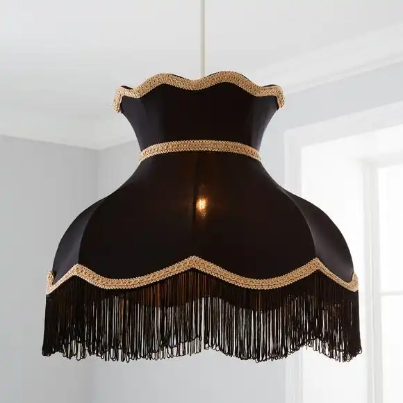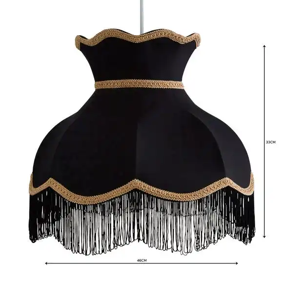 This beautiful Victoria shade would be a perfect feature to any room. It features a scalloped edge, a delicate gold trim, a traditional shape and a tassled fringe presented in a black and gold colourway.