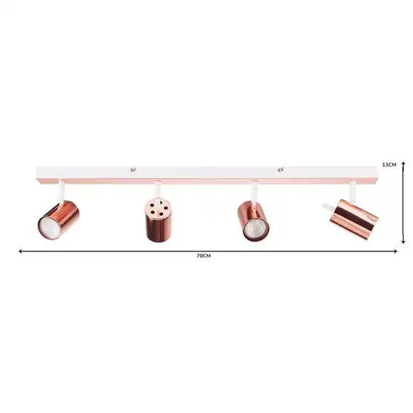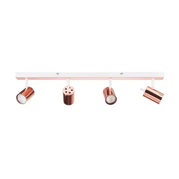 Featuring a bar with four adjustable and dimmable lights, this contemporary LED spotlight is crafted with an on-trend, modern finishes in an elegant copper plated and a painted matt white.