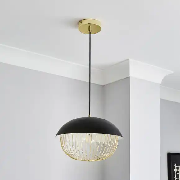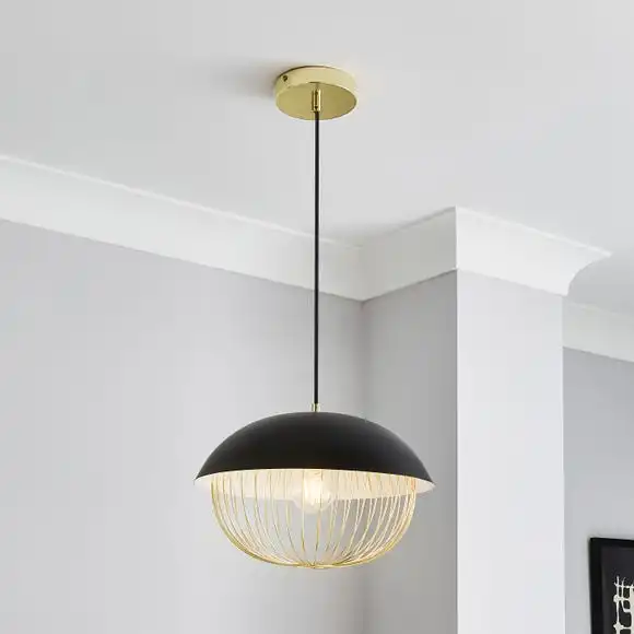 Bring a contemporary feel to your home with this modern Emzo Ceiling Fitting. Crafted with a stunning black painted shade, finished with a striking gold metal cage and a gold ceiling fitting. This stunning ceiling fitting is complete with a height adjustable black cable. This piece is dimmable with a suitable bulb and light switch. Matching Emzo family items are available to help coordinate your décor.