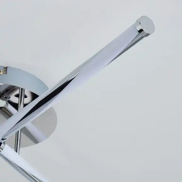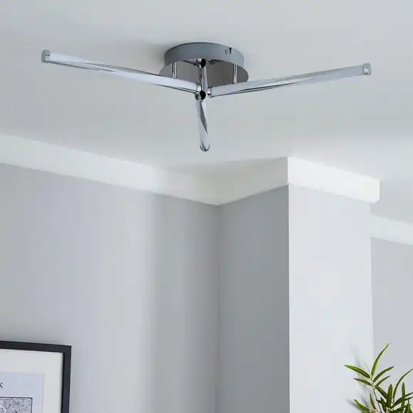 This LED ceiling light has 3 lights with a chrome back plate and integrated LED bulbs.