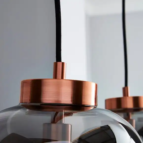 This diner ceiling light has an copper ceiling bar with 3 pill shaped smoked glass shades. This light is adjustable in height and is compatible with a dimmer switch and bulbs.