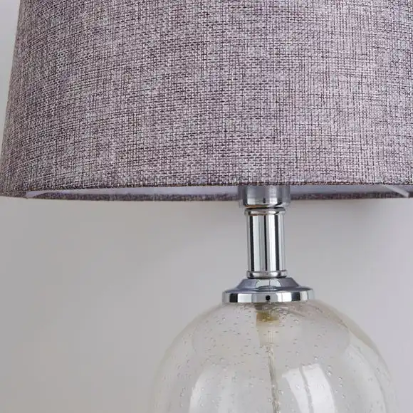 Featuring an unusual bubbled clear glass bottle base, this table lamp is complete with chrome metal detailing and a natural faux linen shade.