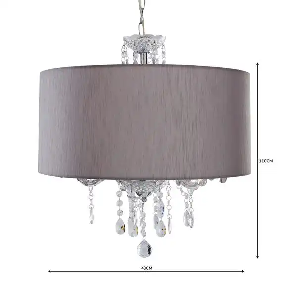 Presenting a luxurious design, the Livia 3 light ceiling fitting, or “Chandelier”, features a stunning Marie Therese style, crafted with stunning cascading clear acrylic drops. Complete with a faux silk, silver-coloured shade and a chrome fitting, this light is sure to bring an opulent feel to any space. This piece is dimmable compatible, making it both an attractive and practical product.