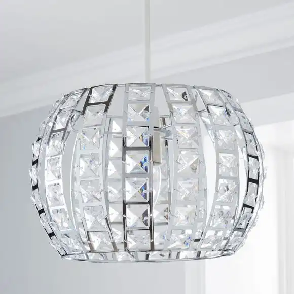Fashioned with slightly curved vertical strips of acrylic clear jewels, this unique ceiling pendant will bring an art deco, sophisticated feel to your interior.