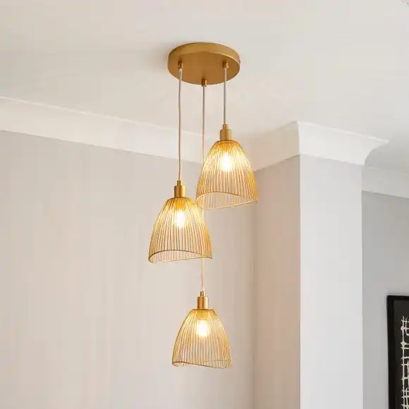 Part of the Elements trend, this stylish Jaula Gold Cluster Ceiling Fitting has a contemporary design that will complement an array of home decors. Featuring a satin gold effect base with three height adjustable gold metal shades, perfect for adding a modern contemporary touch to any room. This piece is dimmable compatible and matching family items are available, helping to coordinate your home to create the dream look.