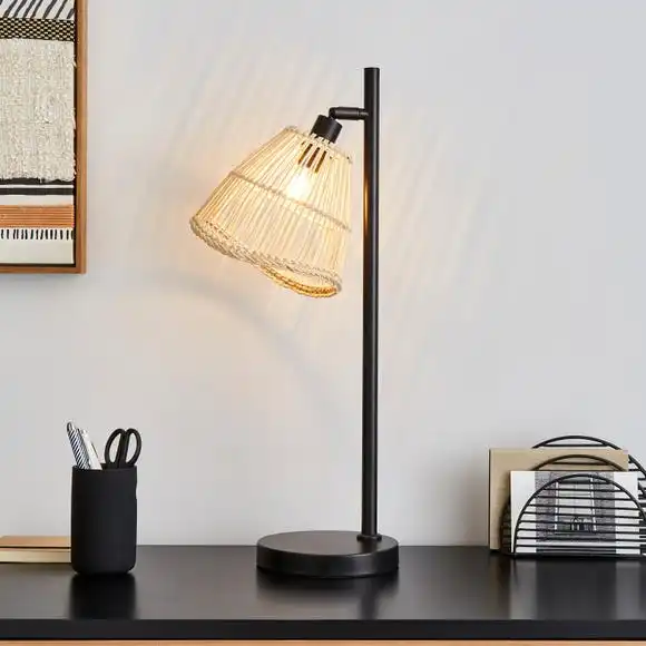 Part of the Elements trend, this stylish Jaula Rattan desk lamp has a contemporary design that will complement an array of home decors. Featuring a black base and straight stem with an adjustable natural rattan shade, perfect for adding a modern contemporary touch to any room. Matching family items are available, helping to coordinate your home to create the dream look.