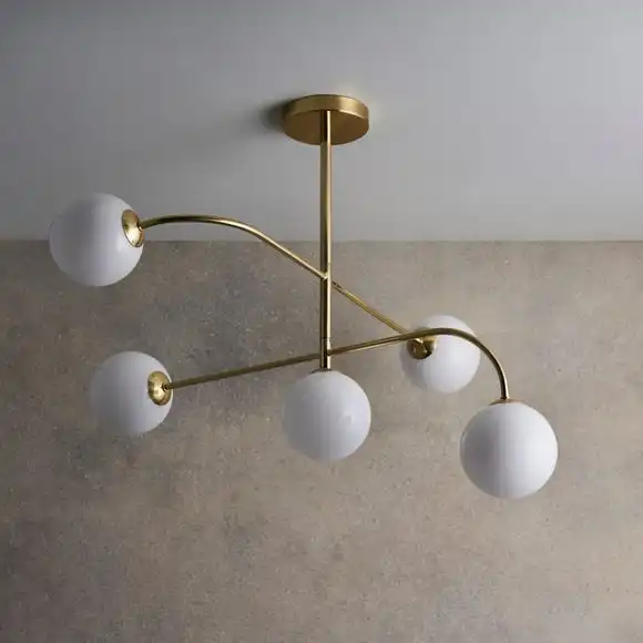Create an ‘on-trend’ mid century feel with the Hartwell Flush Chandelier, a perfect combination of gloss opal blown glass shades with brushed brass metalwork. This ceiling light explores the art of balance with a mix of soft curves blended with a linear structure.
